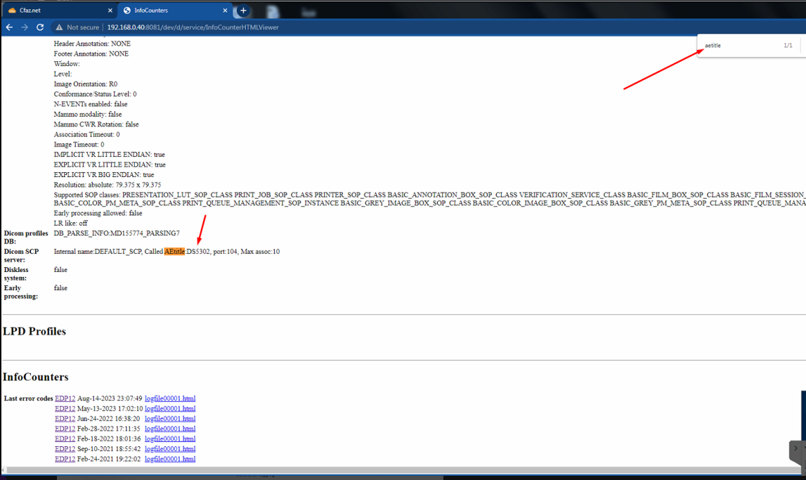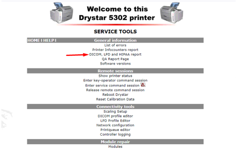 - Os dados da impressora podem ser encontrados no seguinte caminho: "DICOM, LPD and HIPAA report".