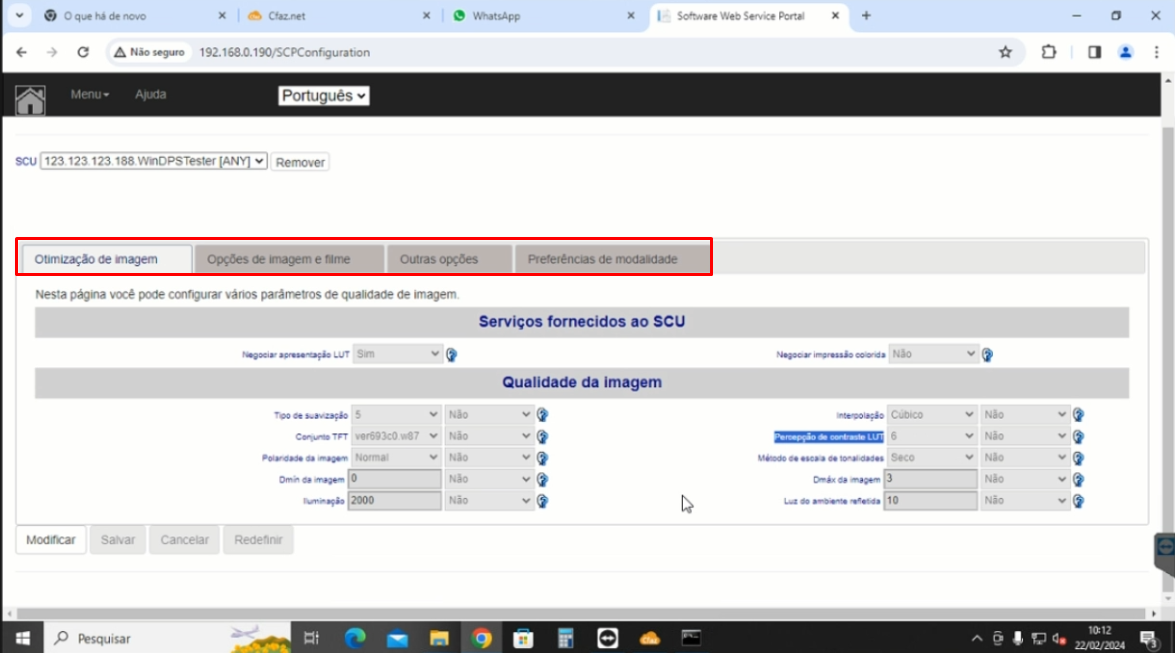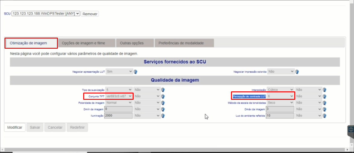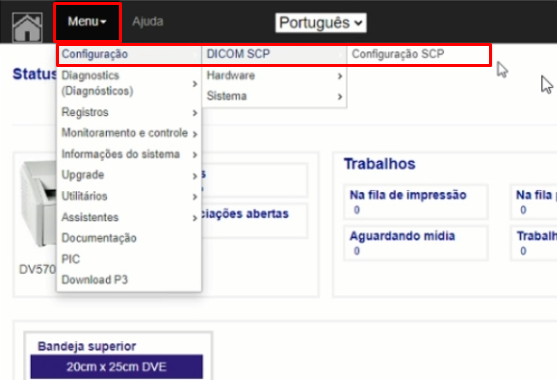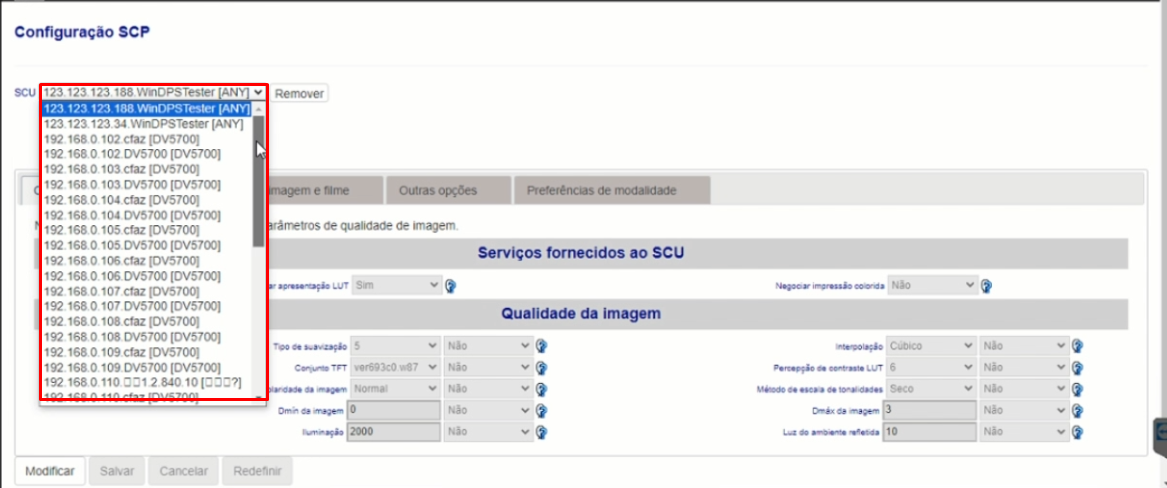 - Clique em menu - > Configuração -> Dicom SCP -> Configuração SCP
