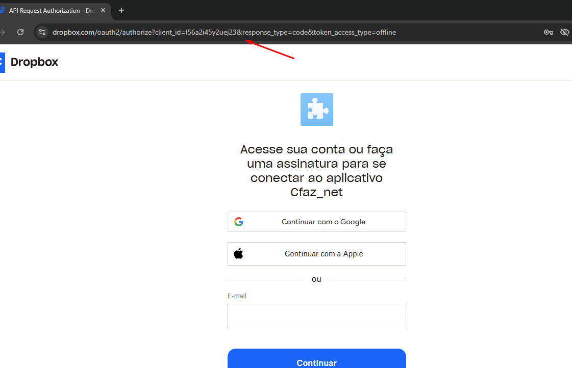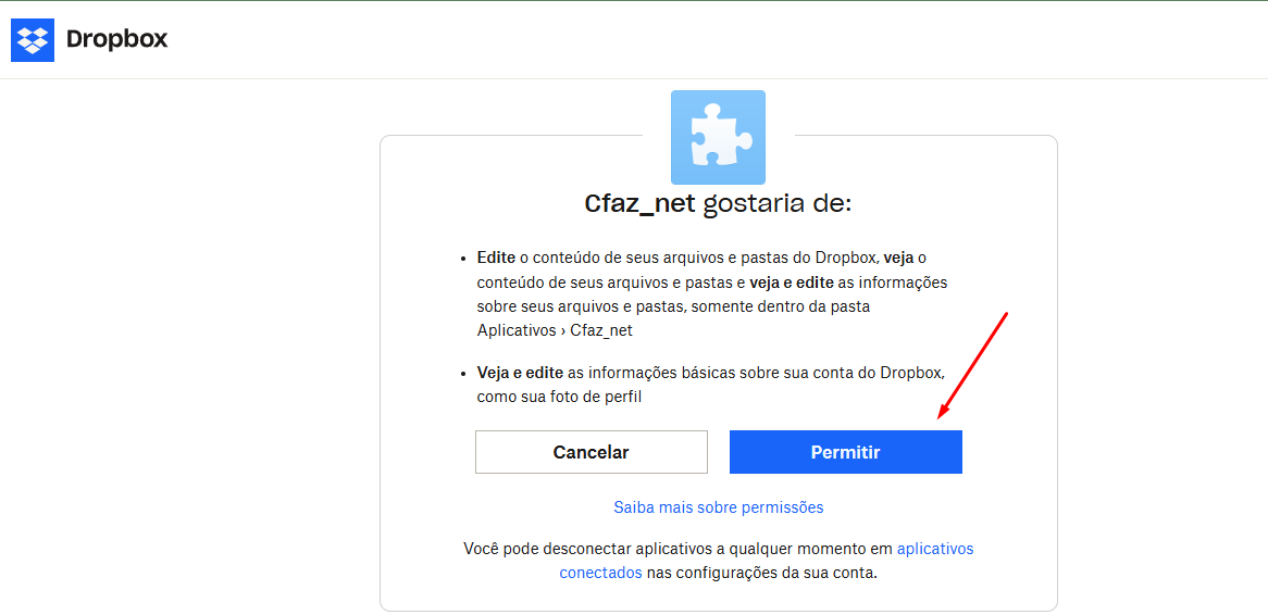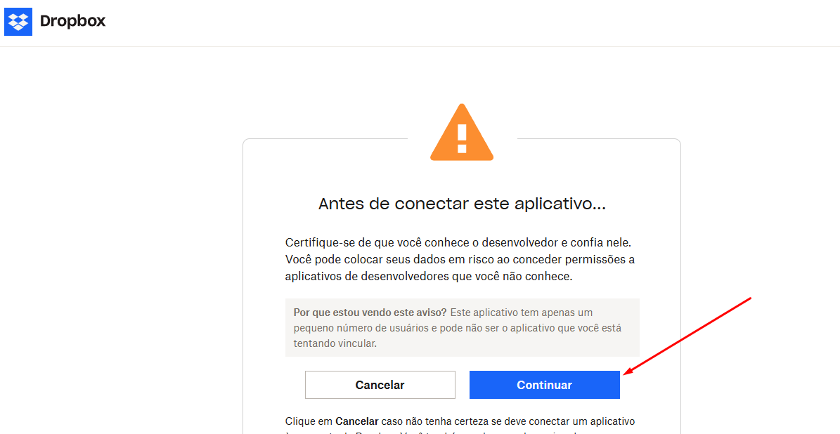 • A Central de laudos irá acessar o Dropbox dela e clicar em continuar caso o Dropbox pergunte se ela conhece o desenvolvedor e confia no sistema.