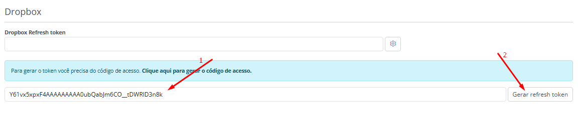 • Voltando na configuração do Dropbox por dentro da edição da clínica, o suporte deve inserir este código de acesso no local indicado e após clicar em “Gerar refresh token
