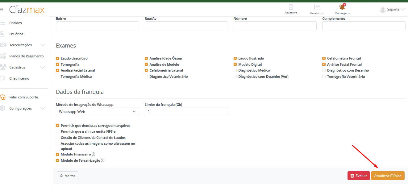 • Deve-se atualizar a clinica para que as novas configurações sejam salvas.