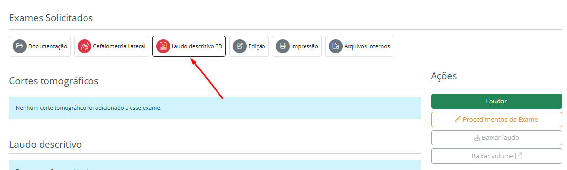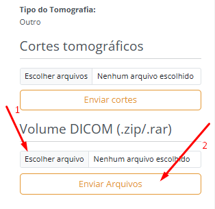 •  Na aba de Tomografia / Laudo descritivo 3D deve se localizar o campo para subir volume dicom e inserir o arquivo .zip ou .rar que estejam com esses arquivos dicom.