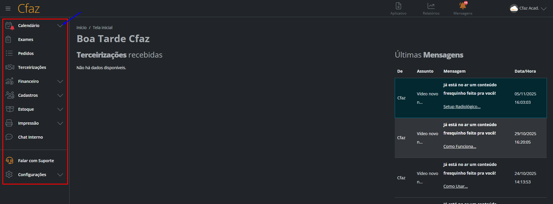 Na tela inicial do sistema, encontramos o menu lateral esquerdo, onde está localizada a maior parte das ferramentas da plataforma.