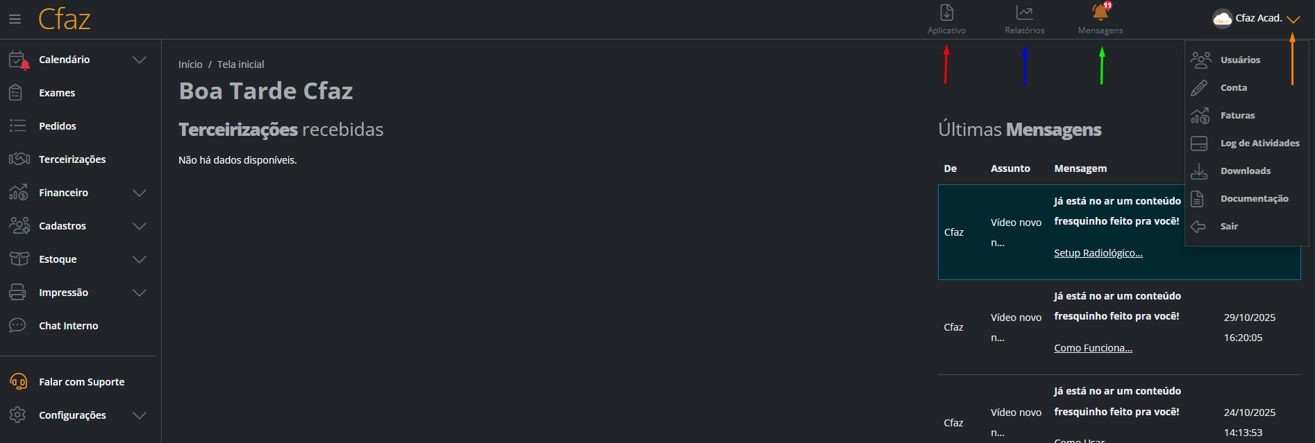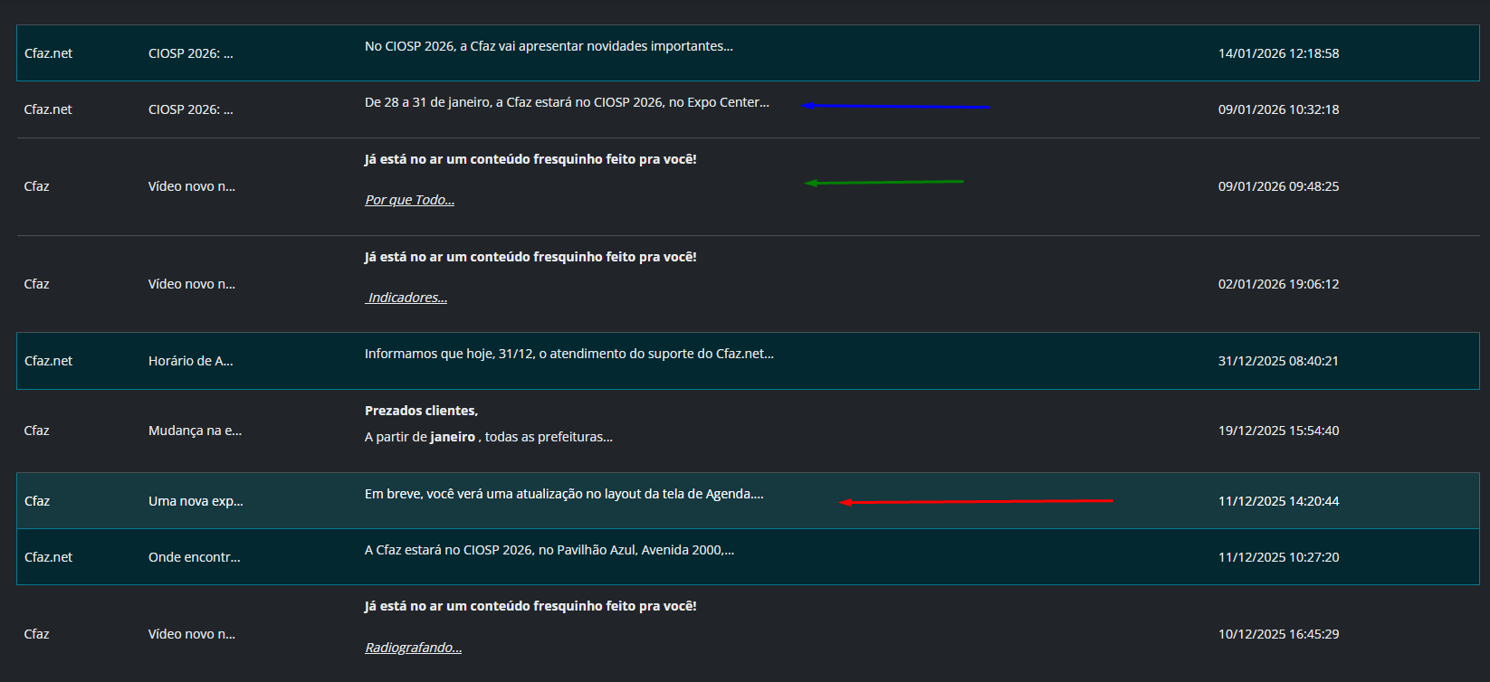 Ao clicar em Mensagens, você encontra os comunicados enviados pela equipe da Cfaz.net.