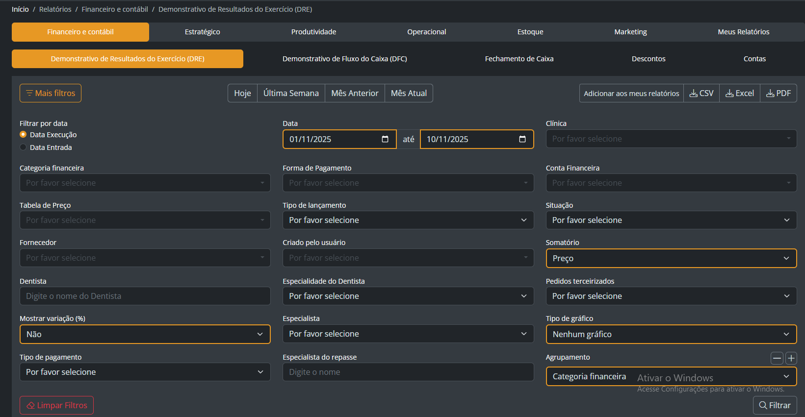 Nessa área é possível visualizar e analisar diversas informações relacionadas à gestão da clínica, como dados financeiros, produção e desempenho.