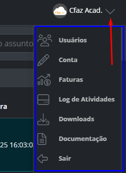 Para acessar as opções de usuário, clique na seta ao lado do seu nome, localizada no canto superior da tela.