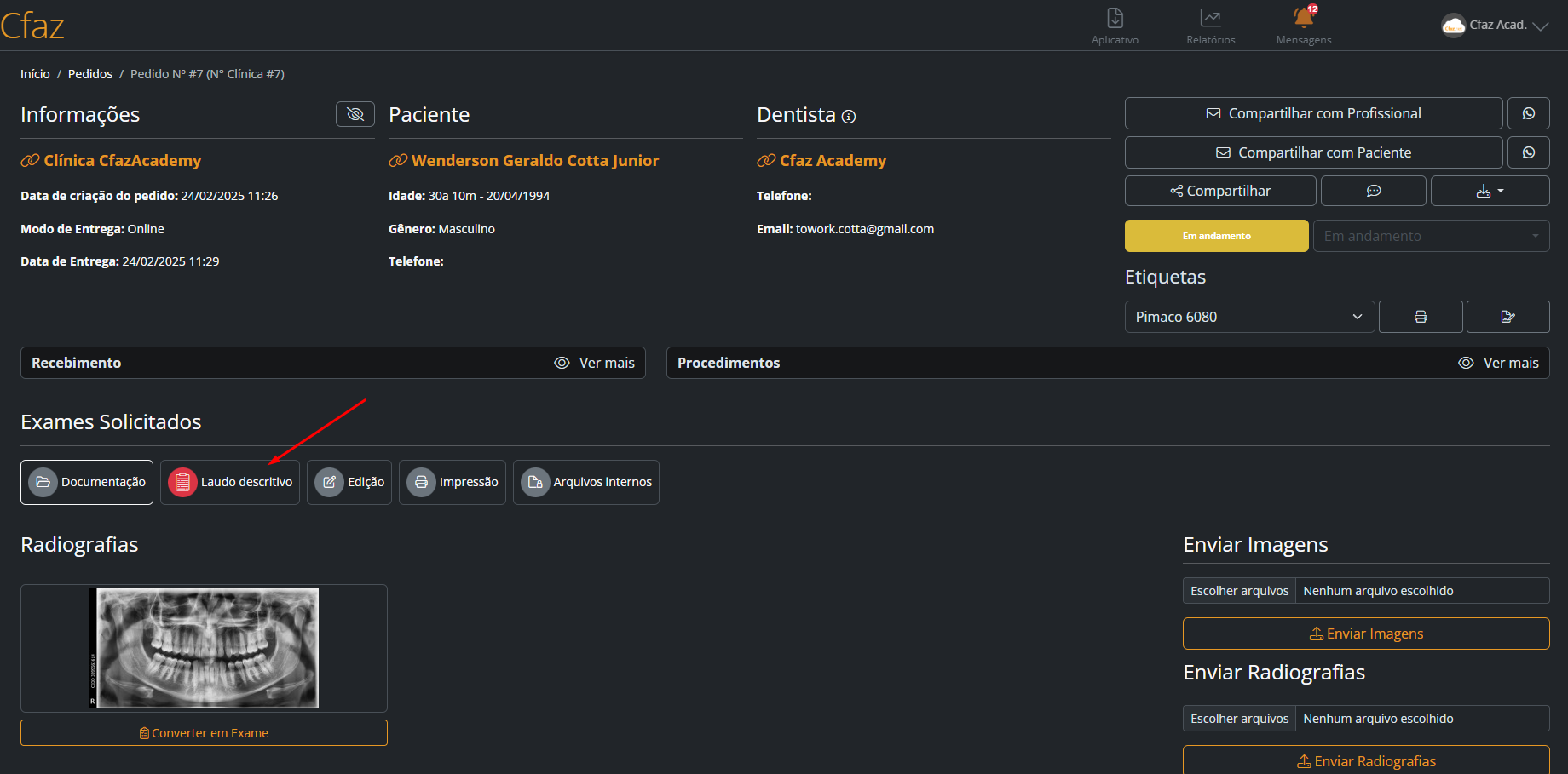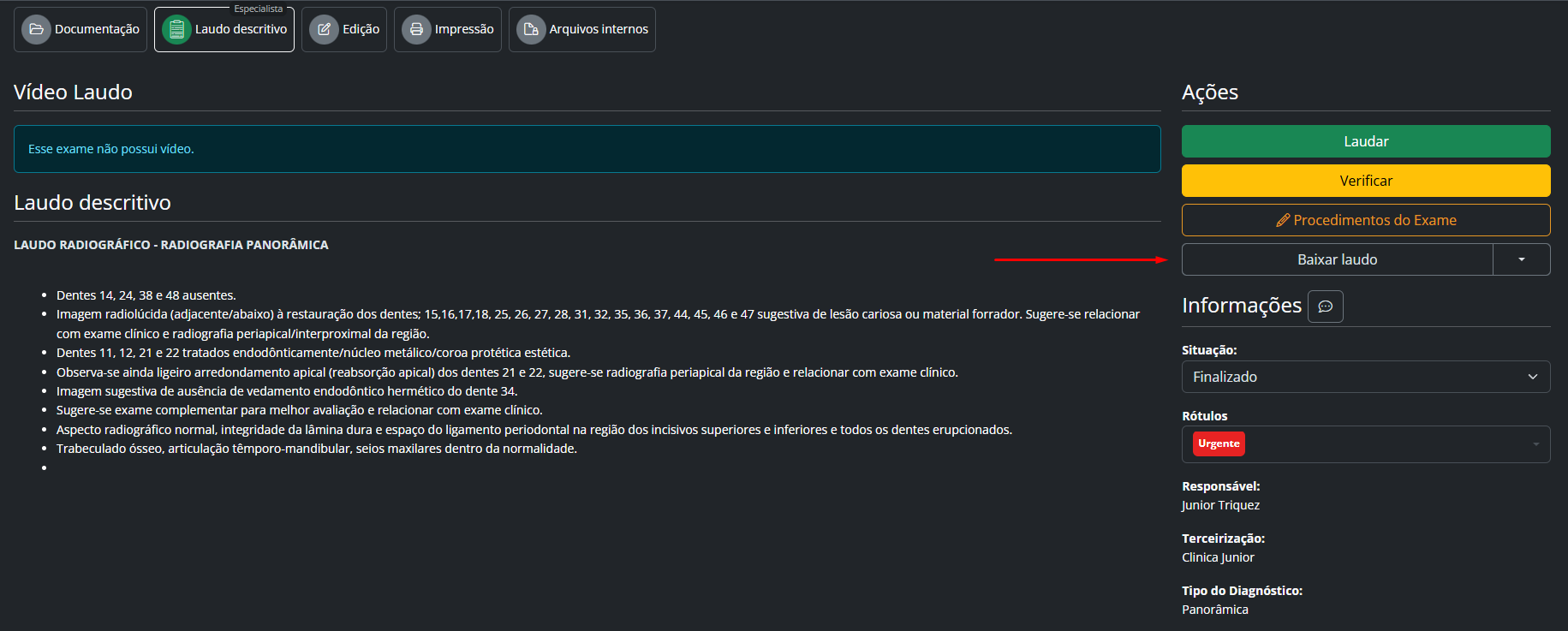 Se voltarmos ao pedido do paciente e acessarmos a aba de Laudo Descritivo, veremos que não é mais possível preencher ou editar o laudo, pois ele agora está sob responsabilidade da clínica parceira. Assim que o profissional terceirizado finalizar o laudo, o documento ficará disponível diretamente nessa mesma aba do pedido, permitindo ao usuário visualizar ou fazer o "Download em PDF".