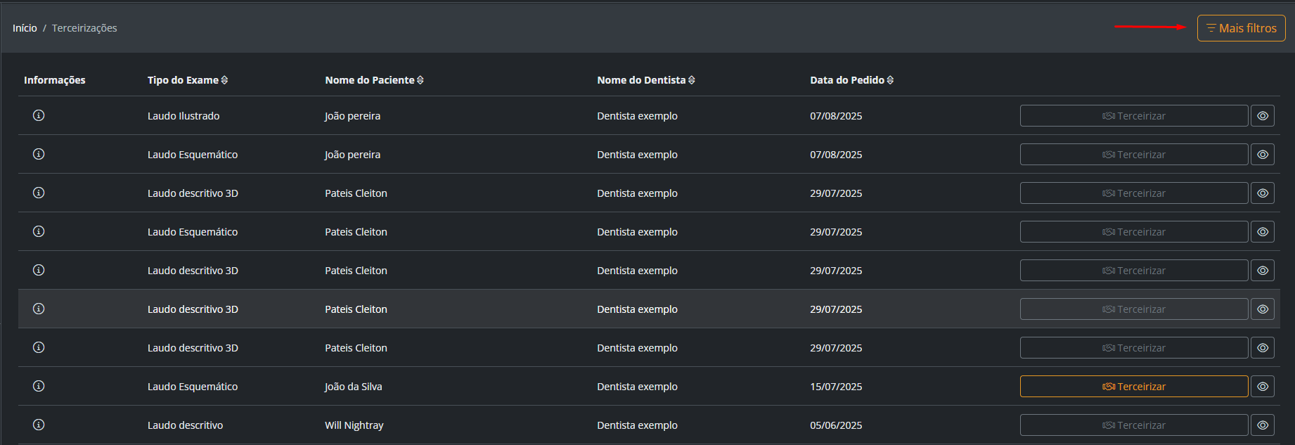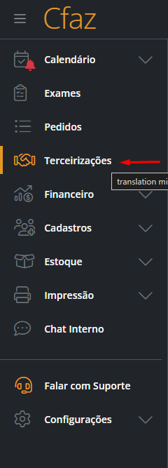 Com a aba criada, o próximo passo é acessar a sessão de "terceirizações" no menu lateral esquerdo, o sistema exibirá todos os exames disponíveis para envio.