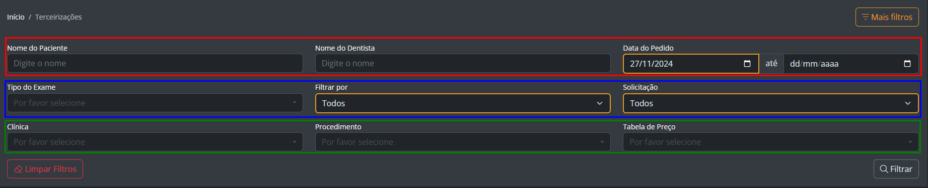 Podemos buscar por "Nome do paciente", "Nome do solicitante", "Data do pedido", Tipo de exame, "filtrar Por", "Solicitação", "Clínica", "Procedimento" e "Tabela de preço"