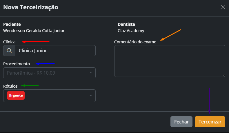Escolha a "clínica" parceira responsável pelo laudo, selecione o "procedimento", "Rótulos", e coloque algum "Comentário" que considere relevante e por fim clique em "Terceirizar".