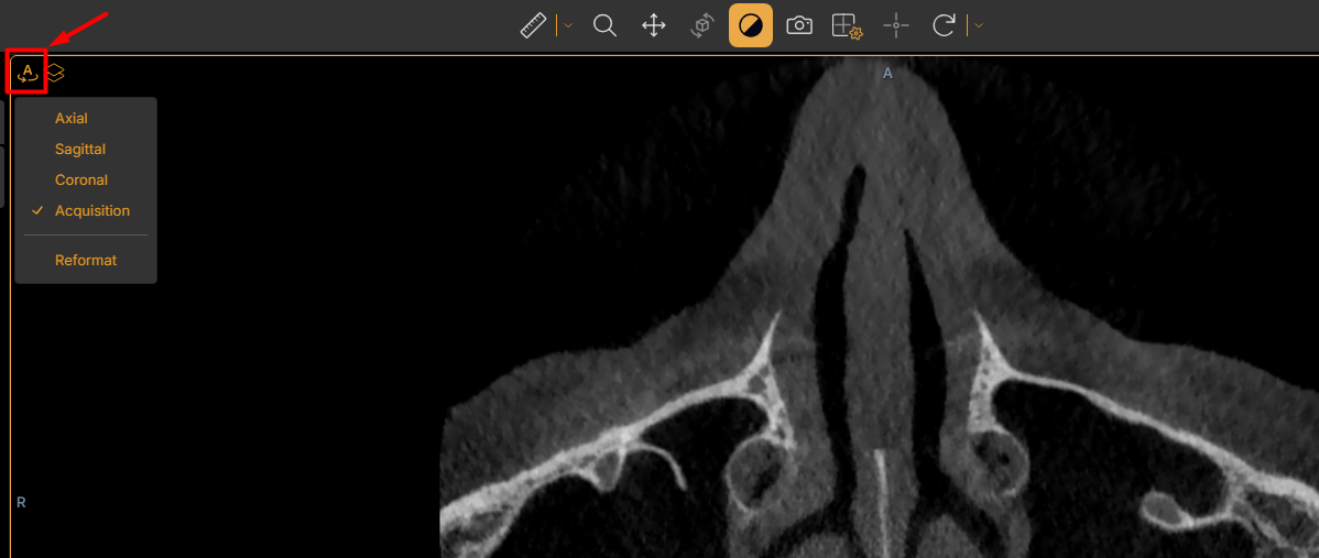Essa ferramenta fica no canto esquerdo superior dentro da janela de visualização de um corte, ela permite escolher em qual plano a imagem será exibida.